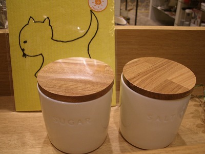 スポンジワイプとお砂糖とお塩いれです。ふたの部分が木になってるところがとってもかわいいです。