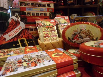 お菓子のたくさんつまったダブルデッカー、キスチョコの形のサンタさん…