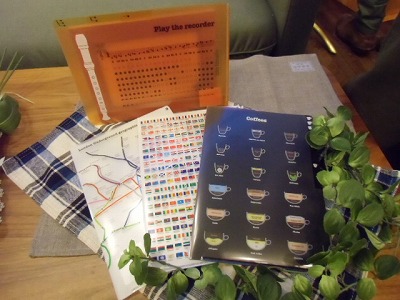 写真はリコーダーの運指表、世界の国旗、コーヒーのバリエーション、ロンドン地下の路線図です。授業中にも楽しめてしまうアイテム。