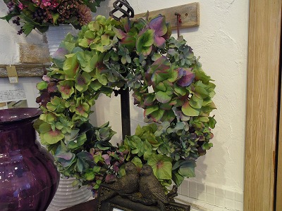 リースも秋色アジサイで・・・ナチュラルな演出で、WELCOMEリースにいかがでしょうか♪