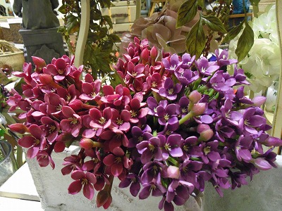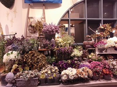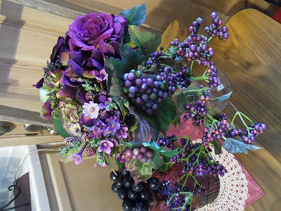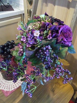 紫の造花を組み合わせてみました。木の実も秋らしくて、秋のディスプレイには欠かせません。