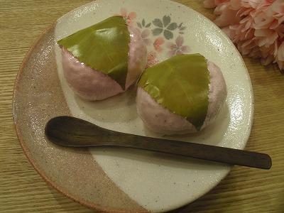 桜の柄のお皿に美味しそうにおかれている、桜餅、、、、