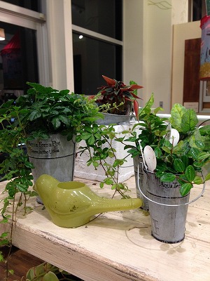 こちらも、陶器の鉢とブリキ製バケツが可愛らしい、グリーン♪