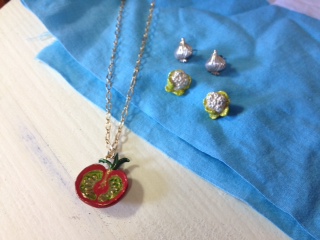 左からトマトのネックレス、玉ねぎピアス、カリフラワーピアスです。