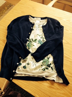 ボタンがたくさんついているのがお気に入りです。中に着たものはボタニカルテイストのサマーニット。