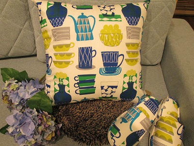 北欧を思わせるような、ポットやティーカップの柄がおしゃれで鮮やかにデザインされている、クッションカバーとスリッパです。