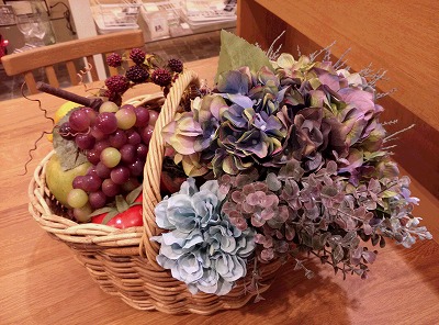夏色のブルーも、紫や果物を添えると秋の雰囲気になります。