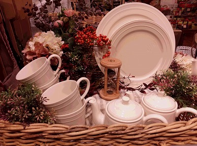 オレンジの木の実と赤紫、クリーム色の組合せ。籠にアレンジすると一段と秋らしく……