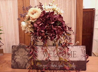 最後は秋らしい赤紫とクリーム色のアレンジ。前に垂れ下がったオータムスマイラックスが流れを出してくれました。