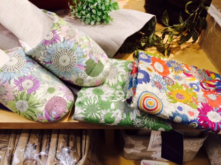 写真は左からスリッパ、クッションカバーです。家族全員違う柄のスリッパを合わせたり、クッションは柄は同じでカラーだけ変えるのがオススメです!