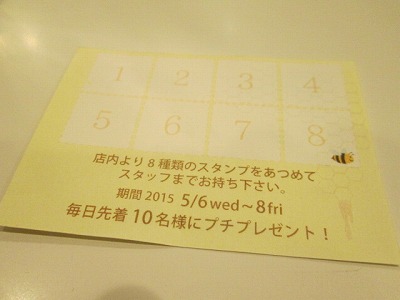 売場のスタッフや、設置された8つのスタンプを集めて、全部そろえば先着10名様にプチプレゼント!というイベントです。