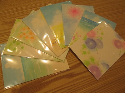 花火や紫陽花、風鈴など、淡く優しい色のポストカード。