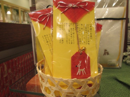 こちらは幸運の白鹿のお守りです。白鹿は神の使いと言われており、また鹿は縁起の良いものとされているそうです。このお守りを持っていたら、きっとあなたに幸運を運んでくれるはず!