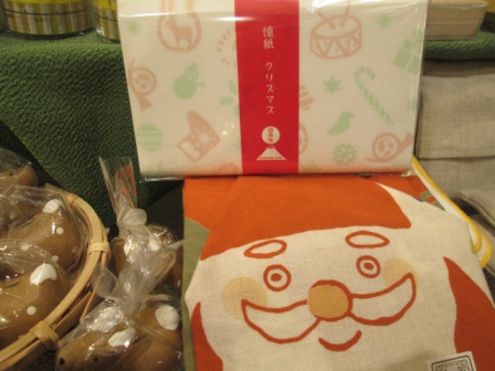 こちらはクリスマスの限定商品、サンタさんの注染手ぬぐいとクリスマス柄の懐紙です。サンタさんの微笑みにキュンときますね!また、懐紙の柄も主張しすぎない鮮やかな色でとても素敵です。和×クリスマスは一見斬新であるかのように思え、しかし落ち着きがあって良いですね~。