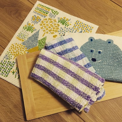 キッチンの水回りで活躍中のスポンジワイプと、花ふきん、ヒノキのまな板です。