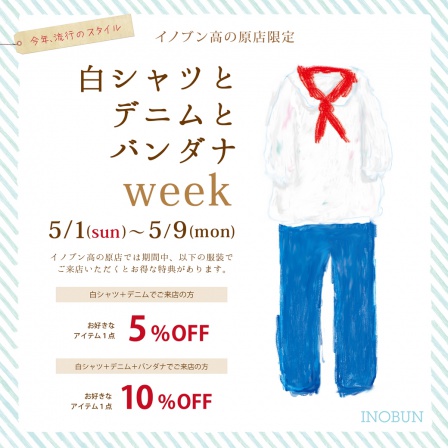 スタッフもこの期間は、デニムと白シャツとバンダナで接客させていただきます。
