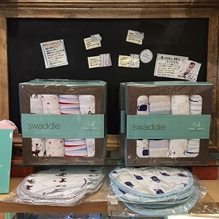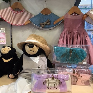 エプロンやスタイも飾って、よりどんな感じが分かりやすくなりました。サンプルは手にとっていただけますので、お気軽にお声掛けくださいね。
