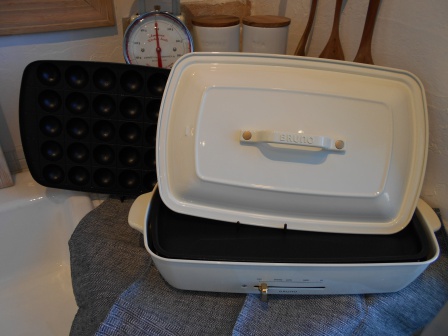2人用ぐらいの小さめのオシャレなホットプレートです。平面プレートとタコ焼きが24個焼けるタコ焼きプレートもついています。