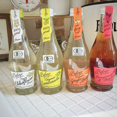 味は、エルダーフラワー・レモネード・ジンジャービアー・ザクロ&ラズベリー、の4種類をご用意しております。