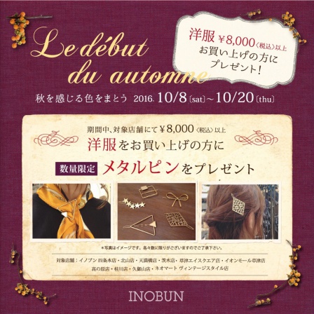 10月8日(土)~10月20日(木)の期間中、対象店舗にてお洋服を税込み¥8000以上お買い上げのお客様に、秋のオシャレにぴったりな「メタルピン」をプレゼントいたします!