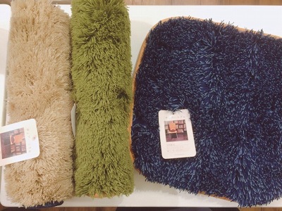 チェアーラグです。今までは丸いモコモコのチェアーラグでそちらも大人気でしたが、今年はスクエア型が登場しました!