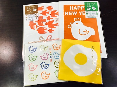 来年の干支は酉ということで、酉にまつわるイラスト入り。お年玉と落とし玉子をかけたシュールさ。むむ、可愛いです。¥ 460+tax