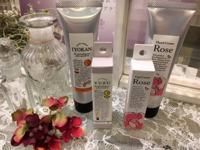 こちらは高知県産のゆず、愛媛県産の伊予柑、オーガニックローズウォーターの精油を使ったハンドクリームとリップクリーム。
