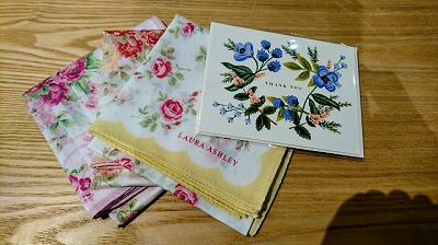 次に紹介する商品はこちらのピンク、オレンジ、イエローのLAURA ASHLEYのハンカチ3枚とRIFLE PAPERのThank Youカードです。