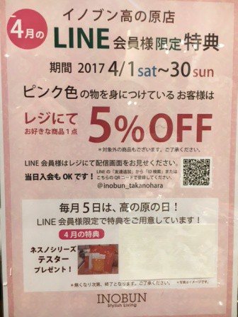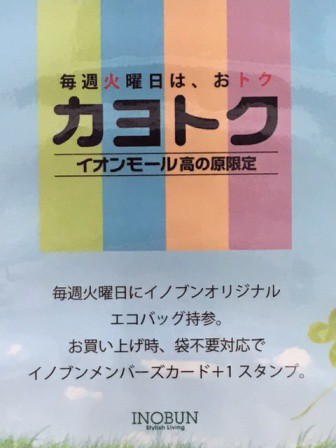 毎週火曜日にイノブンオリジナルエコバッグをご持参。お会計時、袋不対応で、イノブンメンバーズカードプラス1スタンプ。