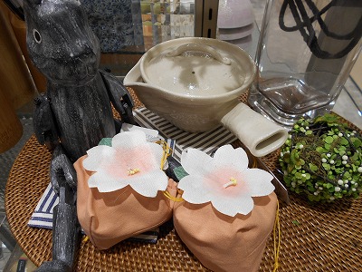 グラスと一緒にかわいいさくらの巾着に入った、中川政七商店さんの季節のおやつでもっと春を感じましょう。