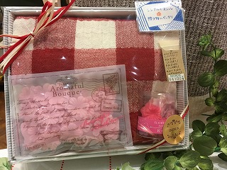 こちらは、オシャレなチェックのバスタオルに入浴剤が2つ入ったギフトです。日頃の疲れを癒してほしいなという思いから作りました♪