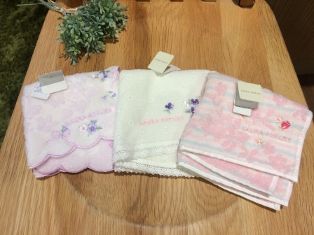 ローラアシュレイのハンカチです。たくさん色や柄がある中でもこちらの3種類が人気です♪