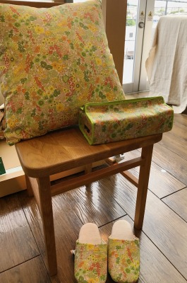 リバティの人気柄で揃えたクッションカバー&ティッシュカバー&スリッパ。