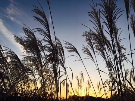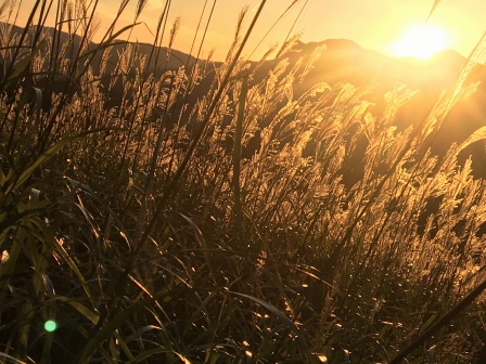 夕焼けがとてもきれいで稲穂もさらに輝いていました。