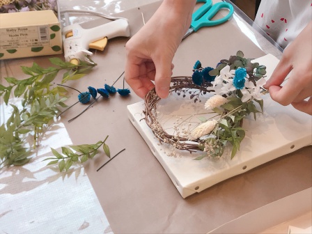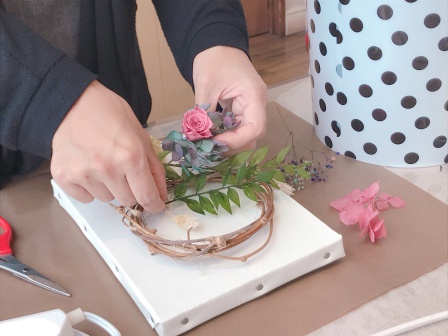 選ぶプリザーブドフラワーで、全く異なる雰囲気のリースが出来ていきました。