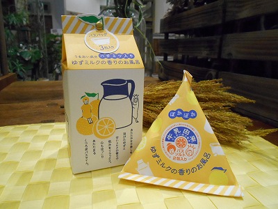 まるで牛乳のようなパッケージのこちら、ゆずミルクの香りの入浴剤です。