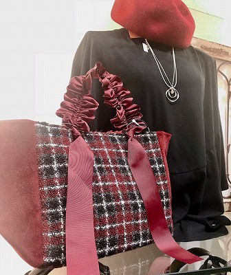 続きまして フリルハンドルトートバッグ。(3900円+税) トレンドのタータンチェックに ハンドル部分のフリルが手元を可憐にみせてくれます ♪