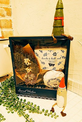こちらは、お肌に優しい天然成分のバスソルトと、天然由来のはちみつをふんだんに使用した石鹸に、クリスマスの飾りに大人気のスワッグがついた、お得なギフトなんです。