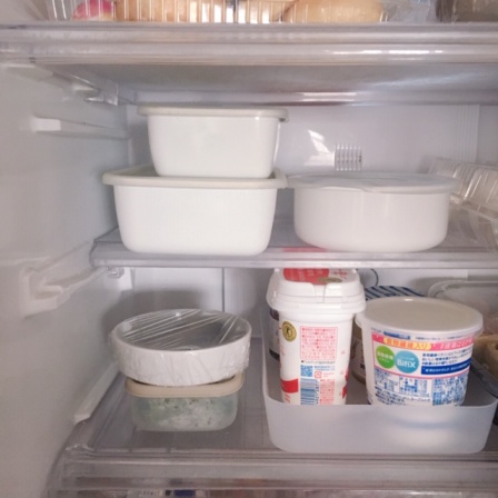 また、お昼ごはんの準備にため息つきながら冷蔵庫を開けたら、目に飛び込んできた、真っ白のホーロー容器たち。