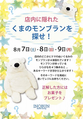 「くまのモンブランを探せ!」店内に隠れているくまのぬいぐるみモンブランを探して、モンブランが持っているひらがなを組み合わせてできるキーワードを見つけよう。キーワードが分かったら用紙に書いて完成させて、プレゼントをゲットして下さい♪