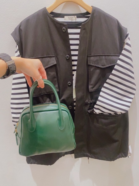 お次はこちら。タイドウェイのトレンドのコンパクトなレザーBAG.¥16500です。こちらも牛革の日本製。しっかりした素材感でハンドルが持ちやすくトレンド感のあるコーディネートにも映えそうです。秋はお洋服が落ち着いてくるので色味を足して持ちたくなりそうです。