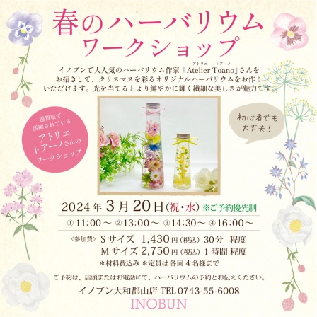 日差しが暖かくなり、春を感じられるようになりわくわくします✨この度、イノブンで人気の作家アトリエトアーノさんをお招きして 春を彩るハーバリウムのワークショップが決まりました!
