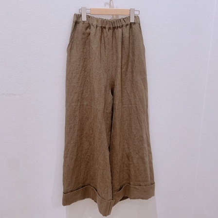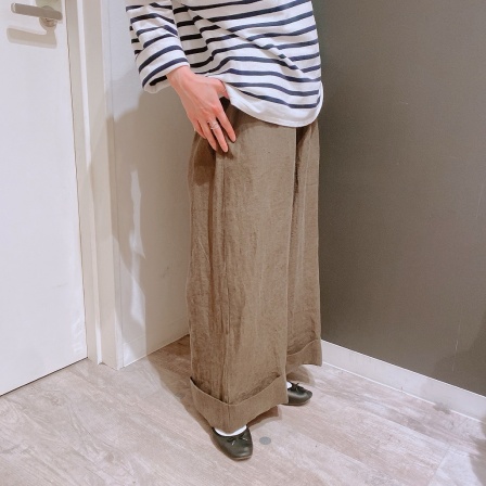 かなりワイドなパンツですが、リネン素材なので広がりすぎず、程よく足元に重さが出るのでストっと履けちゃうワイドパンツ。