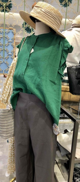 夏に映えるカラーブラウス。一枚で上品に仕上がります。