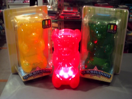 こちらはベア―グミの形のライトです。電池式でどこでも置くことができるし、ずっと点灯させることも1時間で消えるオフタイマーも付いています!