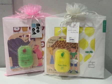 外に持ち歩いていつでも手洗いできる便利な紙石鹸とフルーツの柄が可愛い千代紙タオルのギフトです。