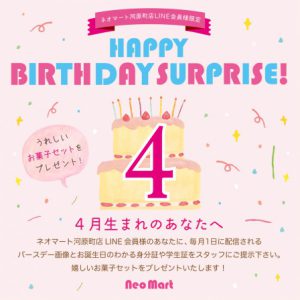 4月生まれのお客様!お誕生日おめでとうございます!いつもネオマート河原町店にご来店いただきまして、本当にありがとうございます