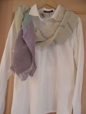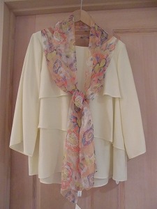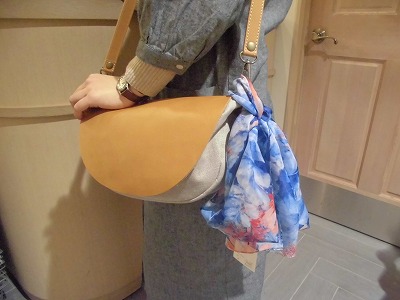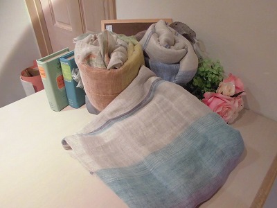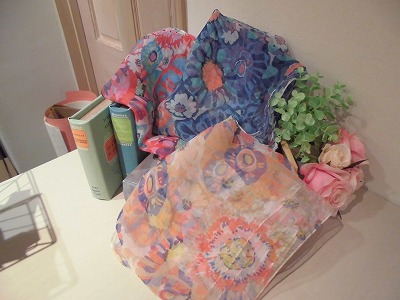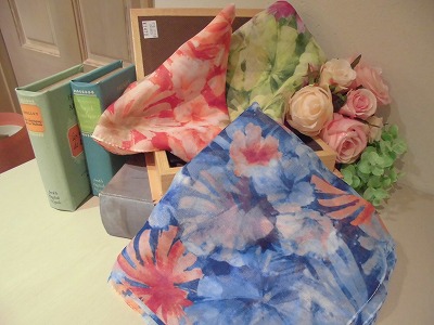 透ける素材のスカーフは色が重なるので、その重なりも楽しめます。