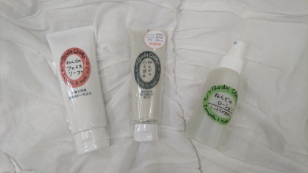 左から、「ねんどのフェイスソープ(¥1700+税)」・「ねんどのハミガキ(¥1050+税)」・「ねんどのローション(¥1500+税)」です。