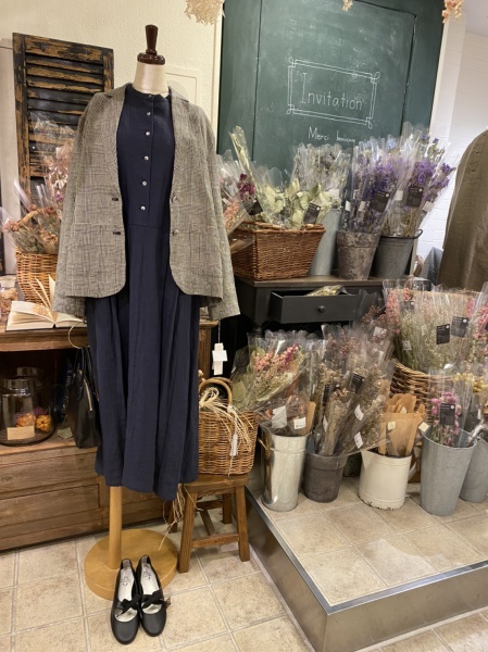 まず一つ目のコーディネートは、ジャケットとネイビーのワンピースを合わせてお仕事にも着ていただけるような「きれいめスタイル」にしてみました。ジャケットはリネン素材なので、抜け感のある印象になります。